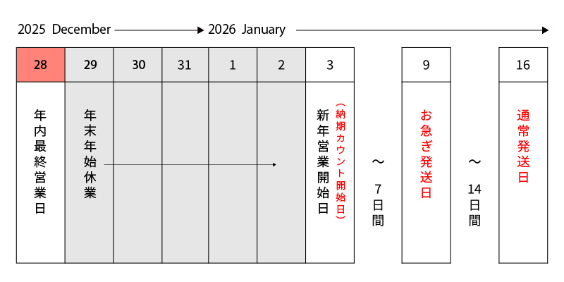 年末年始休業中にお申込みいただいたご注文の納期は、1/3よりカウントをさせて制作させていただきます。