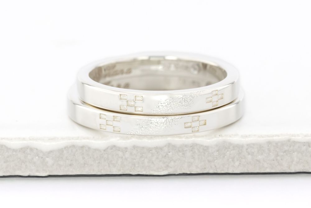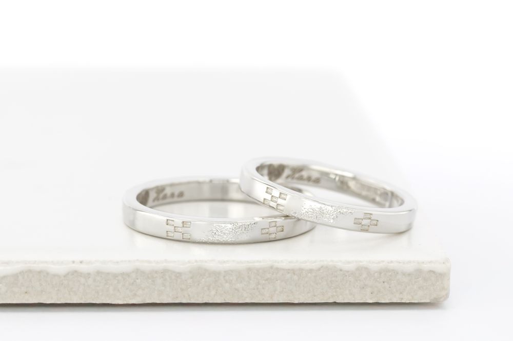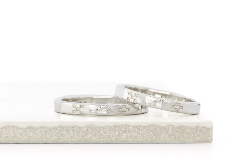 沖縄で育った人にとって、 馴染み深い模様といえば「ミンサー」ではないでしょうか。 五つと四つの絣(かすり)模様に込められた 「いつ(五)の世(四)までも、末永く…」というメッセージ。 かつて大切な人へ贈られた帯の記憶は、 今、美しいリングへと形を変えています。
