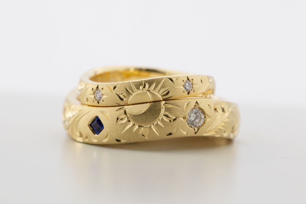 愛するハワイアン彫りの中央には、互いを照らし合う「太陽と月」を配し、