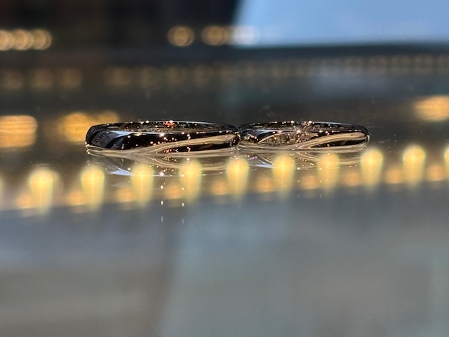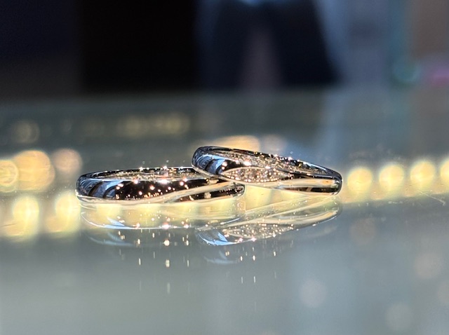 大阪梅田店にてご制作いただいた、素敵なお二人のご結婚指輪をご紹介いたします。 WAXコースはワックスと呼ばれるロウを削り原型を作っていただき、それを基にプロのクラフトマンが指輪を作るコースでご制作いただきました。 WAXコースは細部にまでこだり、幅広いデザインのリングを作れるのが特徴です。 お素材はプラチナ、シンプルな甲丸に逆甲という溝のようなデザインを入れることでオシャレな仕上がりに。 女性様のリングは3石ホワイトダイヤモンドを付けており、彫り留めという留め方で流れを綺麗に見せるデザインに仕上げております。 この度はご制作いただき誠にありがとうございました。 お二人の末永い幸せをスタッフ一同心よりお祈り申し上げます。