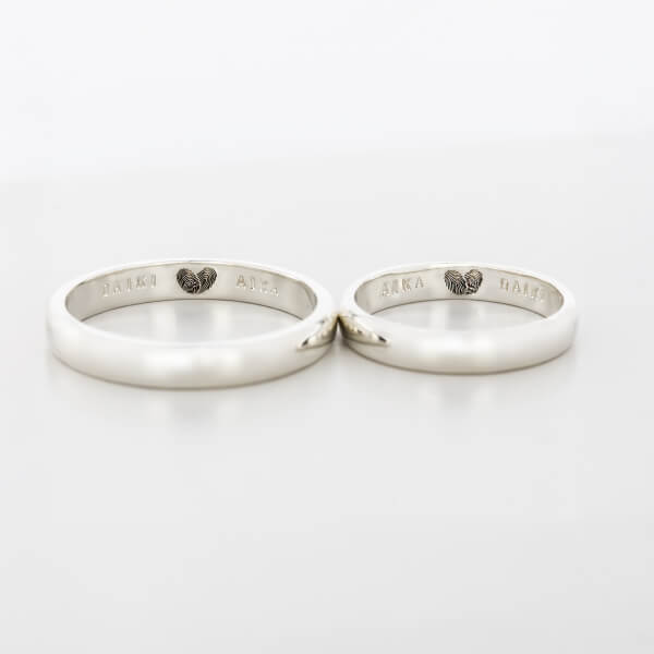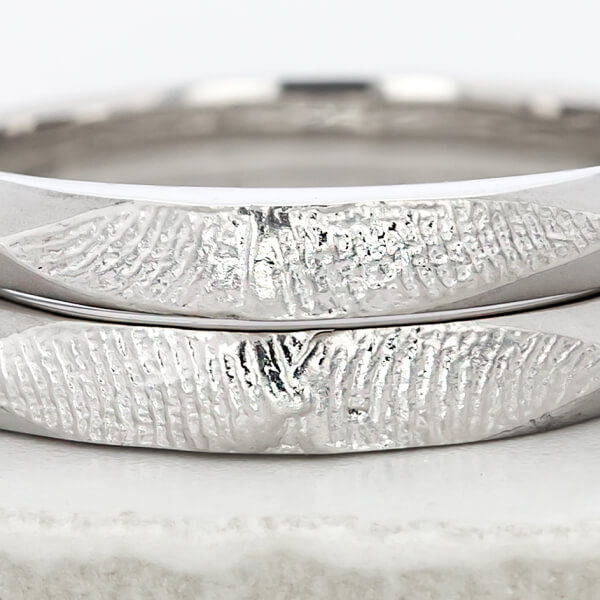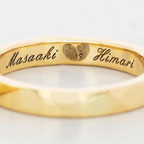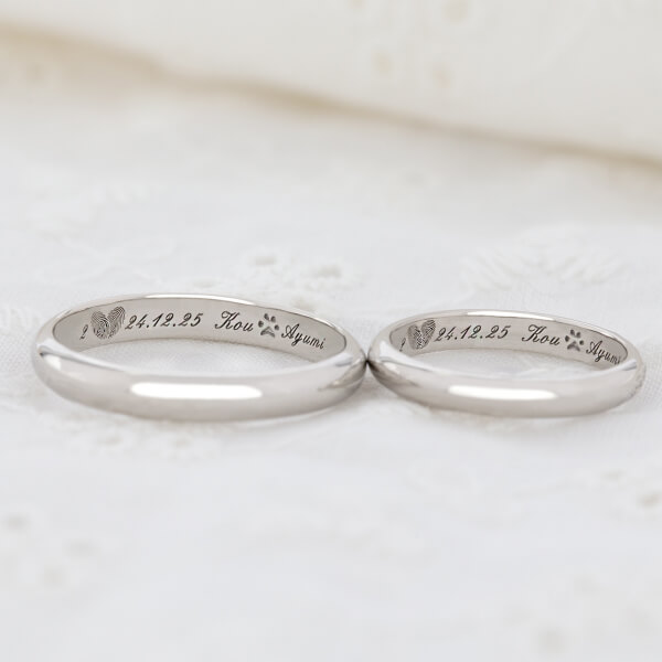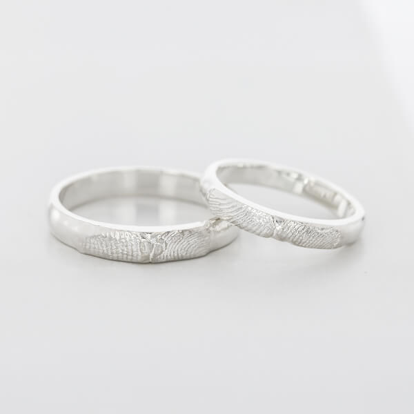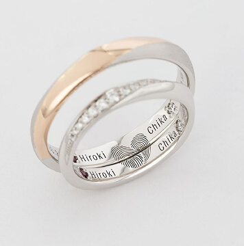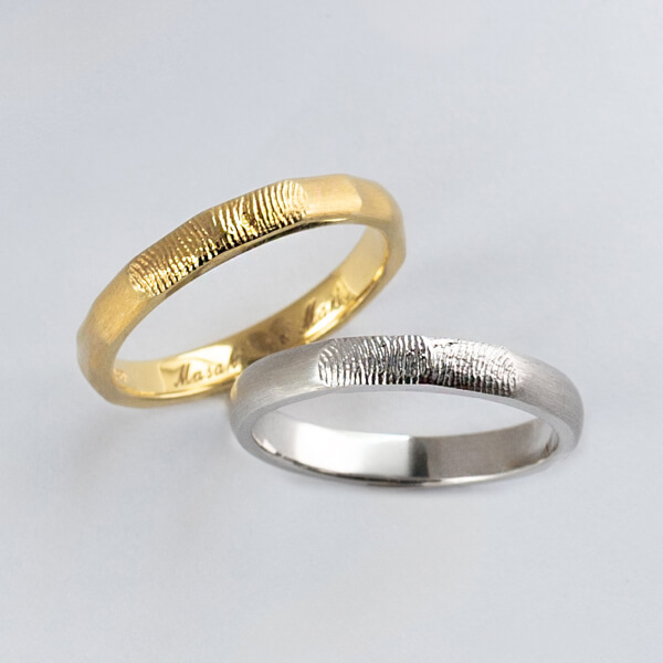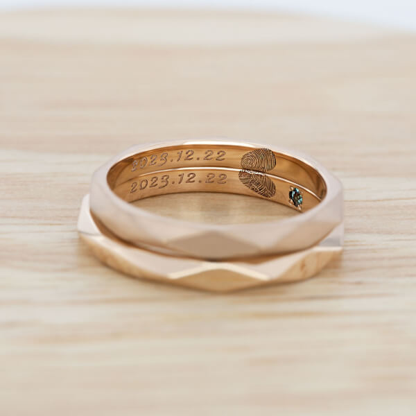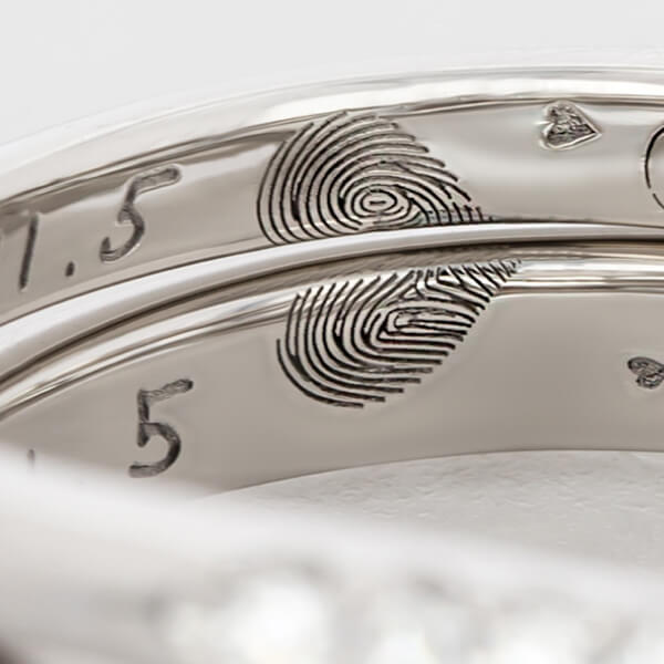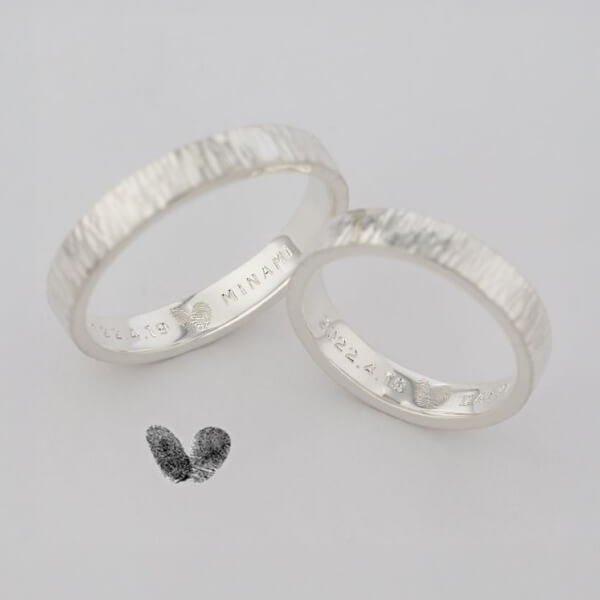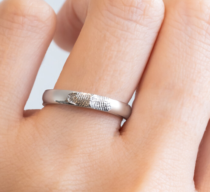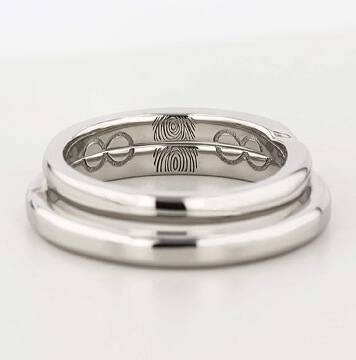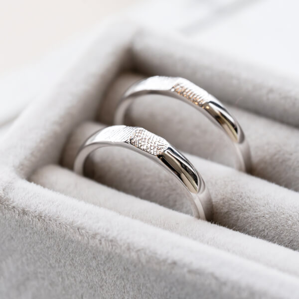 指輪のデザイン自体はシンプルに、でも内側にはこだわりたいと思っていました。 お互いの指紋を記念日と一緒に刻印してもらったのですが、仕上がりの繊細さに驚きました。指紋のラインまで綺麗に再現されています。一見シンプルなのに他にはない指紋デザインがとてもお洒落で、希望通りの指輪に大満足です。