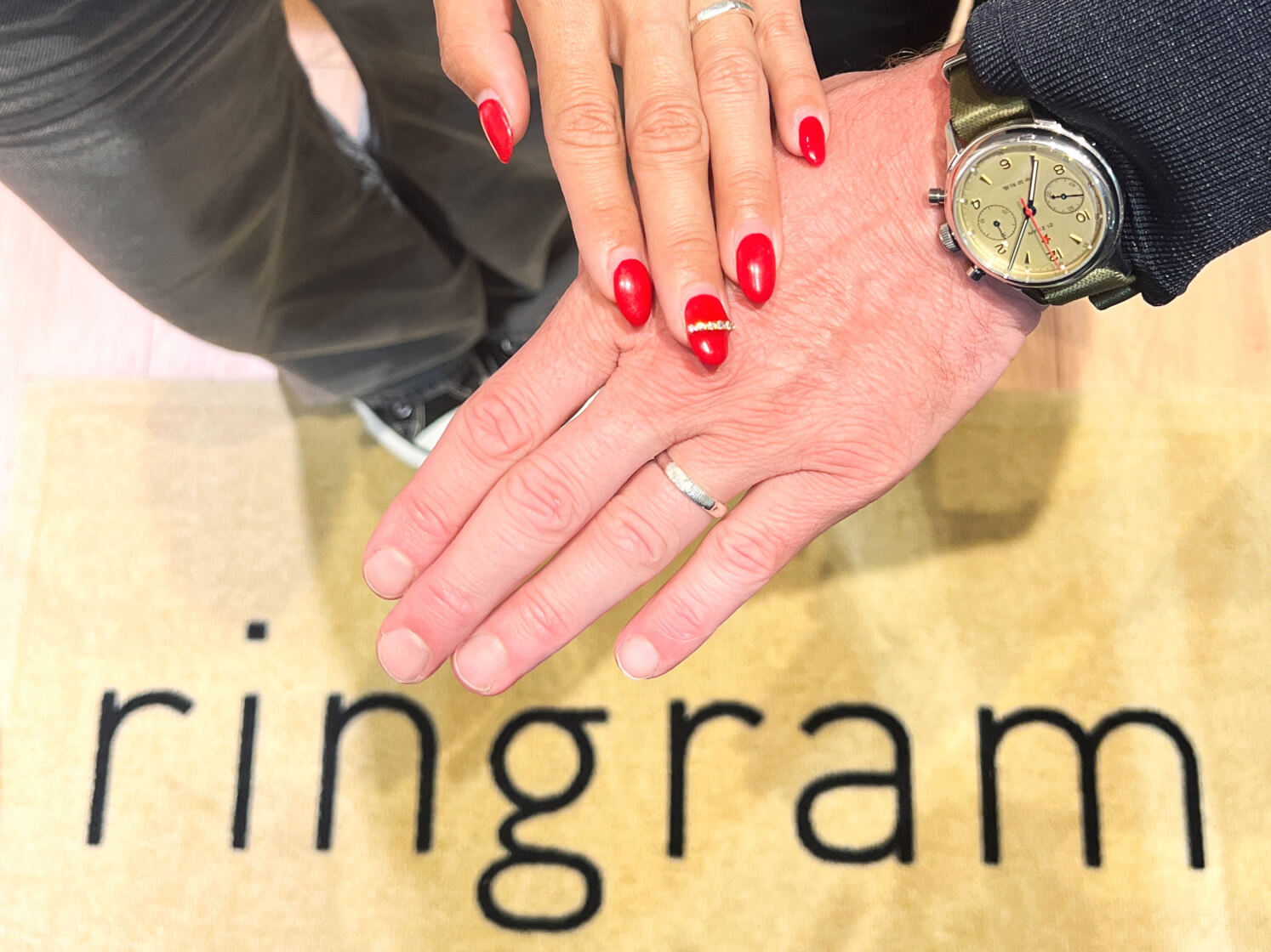 シンプルな指輪に見えて、よく見ると二人の指紋が重なっている…そんな密かなこだわりが気に入っています。WAXで指紋を採るのも緊張しましたが、指輪作りの良い思い出になりました。人とは被りたくないけれど、派手すぎるのは苦手という方には良いと思います。